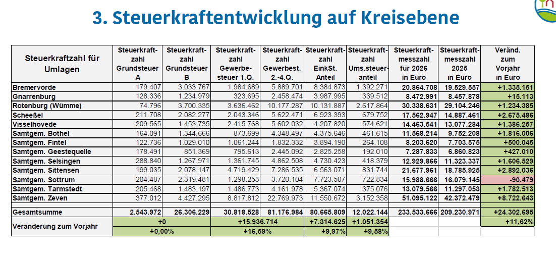 Aufgrund der hohen Abgaben an den Kreis ( Erhöhung der Kreisumlage um 3 Punkte auf 47 % ) muss die Samtgemeinde ggf. ebenfalls die Umlage erhöhen was dann letztlich an den Mitgliedsgemeinden Zeven, Heeslingen, Gyhum und Elsdorf hängen bleibt. Dies kann dann schon ganz schnell zur Erhöhung der Steuern führen.
