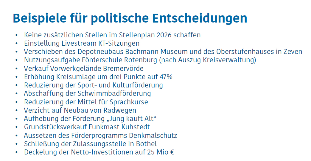 Nachfolgende Vorschläge werden vom Kreis zum Sparen gemacht. Wenn man bedenkt, dass die Rotenburger und Bremervörder bestimmt nicht Zuhause den Rotstift ansetzen werden, ist zu vermuten, dass es mal wieder Zeven trifft.